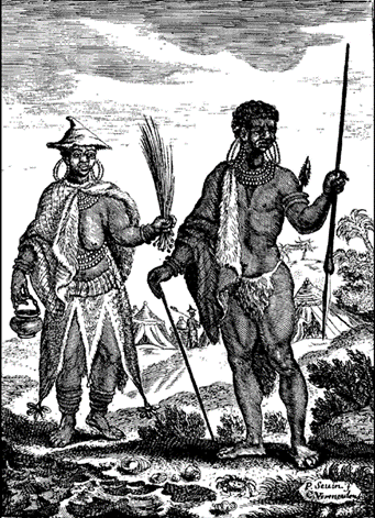 Figure 1: Cape "Hottentots" engraved by Pierre-Paul Sevin and Cornelis Vermeulen for Guy Tachard’s Voyage de Siam (1686), based on a drawing by Hendrik Claudius.