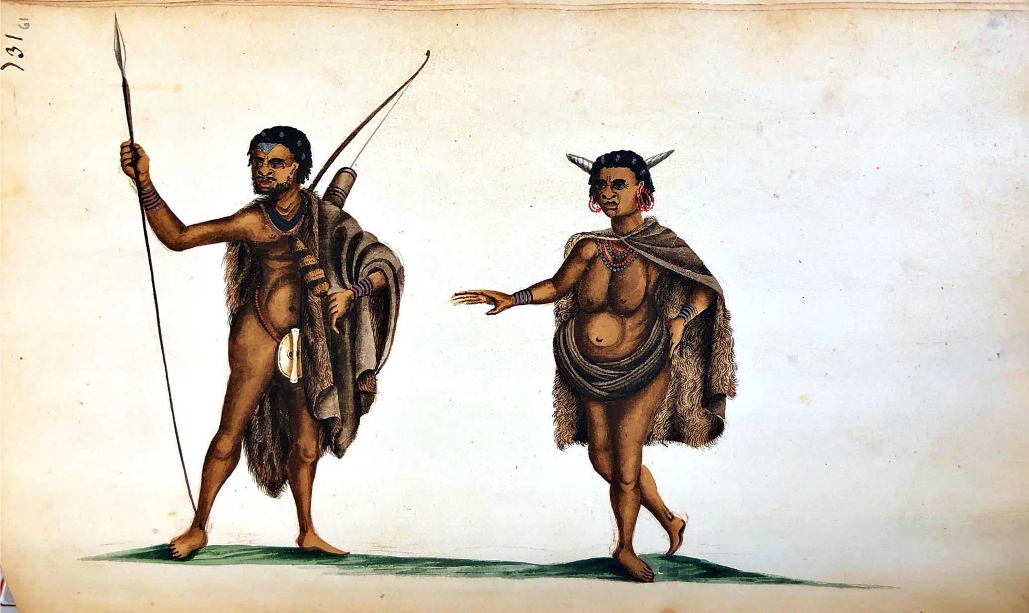Figure 2: Namaqua man and woman, painted by Hendrik Claudius in the TCD MS IE 984 f. 61.